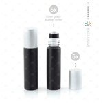 Contents: Set of 5 10ml Frosted Glass Roller Bottles, Premium Stainless Steel Rollers and Metallic Caps.